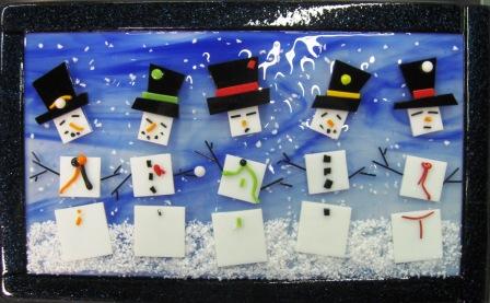 Each snowman has his own personality! Sharon used frit to get the effect of snow. She pre-fired the base before adding the decoration on top.